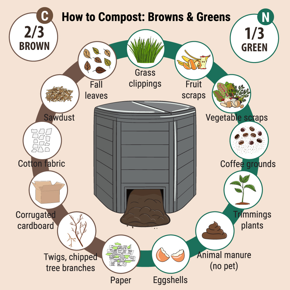 Combine nitrogen-rich greens (food scraps, grass clippings) with carbon-rich browns (dry leaves, cardboard) in roughly a 1:3 ratio to fuel microbes effectively without odors or slowdowns.​
